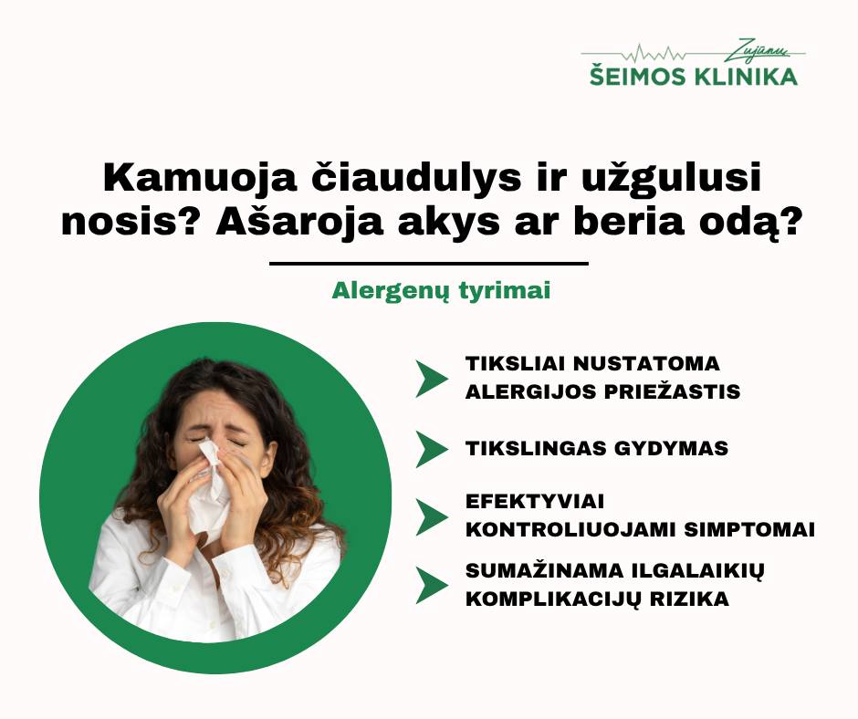 Alergijos gali būti įvairių formų – sezoninės (žiedadulkėms), maisto, gyvūnų, dulkių erkėms ar kitiems aplinkos veiksniams. Dažnai šie simptomai painiojami su peršalimu ar bendru organizmo nusilpimu, todėl tikroji priežastis lieka nepastebėta. 🤧
